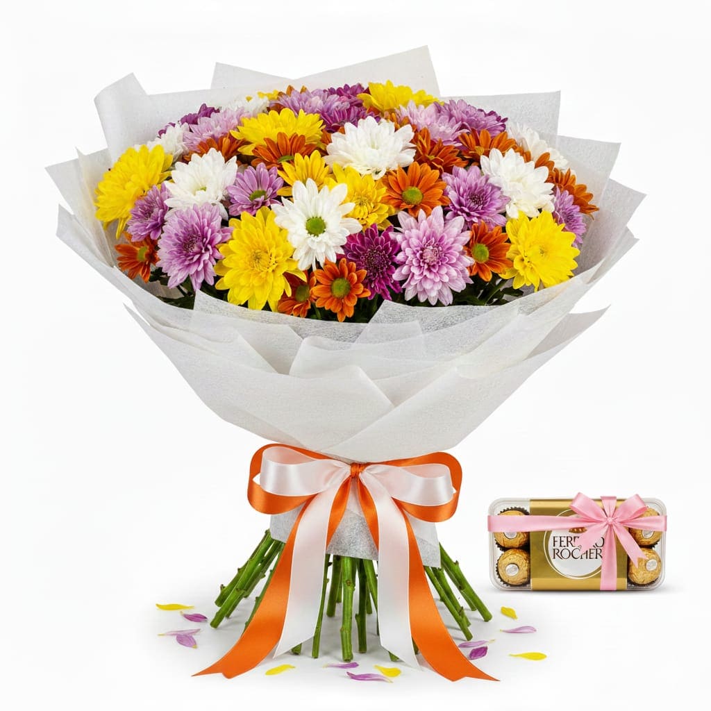 Home » Shop » Birthday Flowers & Gifts Nairobi | Same-Day Delivery » Mixed Mums Bouquet & Ferrero rocher T16