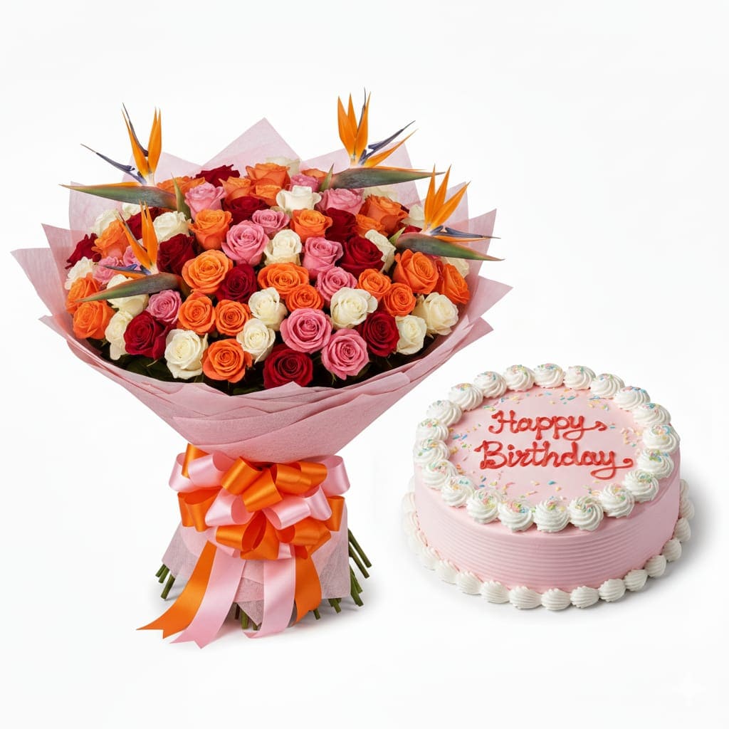 Mixed Roses & Birds of Paradise Bouquet with Cake