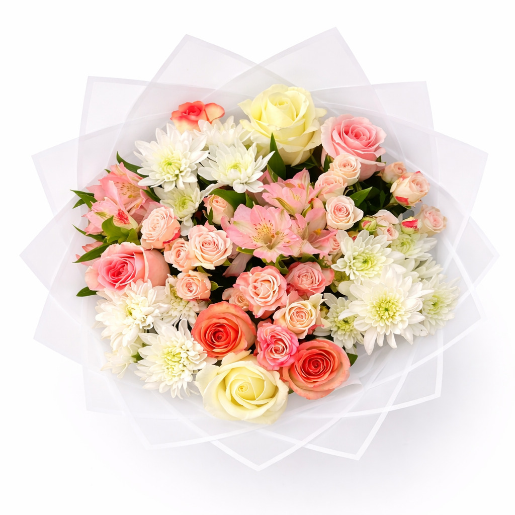 Be the first to review “20 Pink & White Rose mixed with Mums & Alstroemeria Birthday Bouquet” Cancel reply
