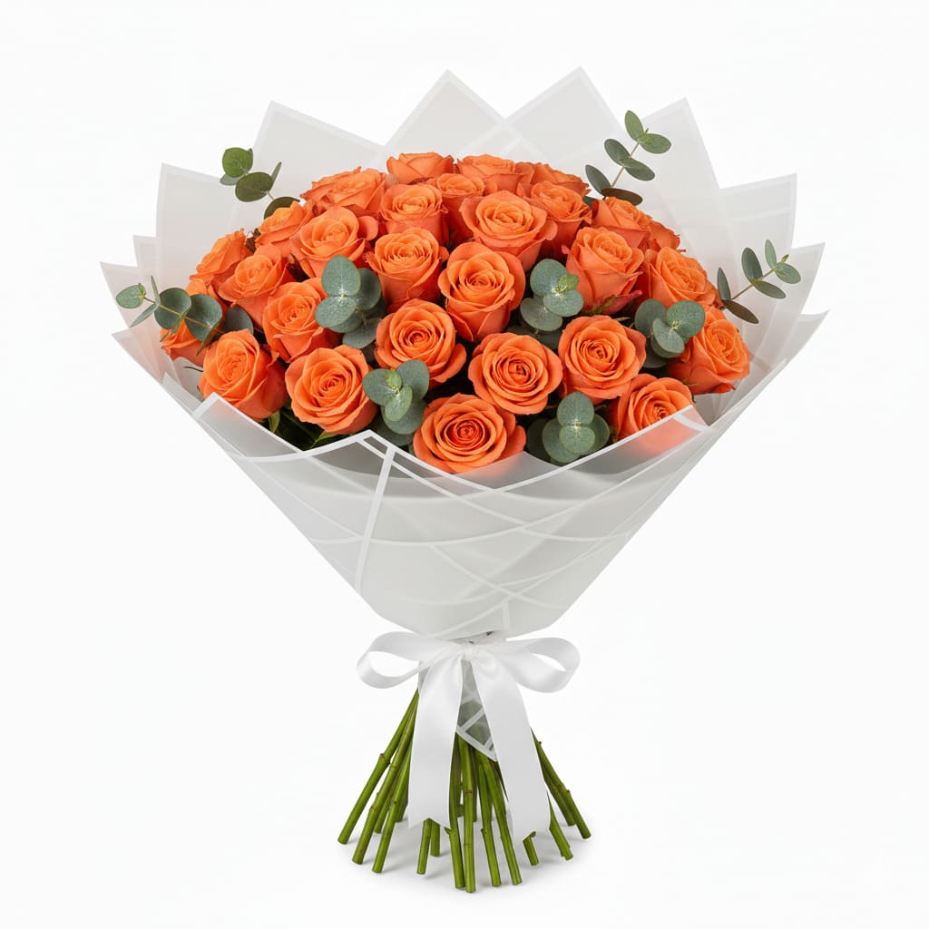 Home » Shop » Birthday Flowers & Gifts in Nairobi » 30 Orange Rose with Eucalyptus Birthday Bouquet